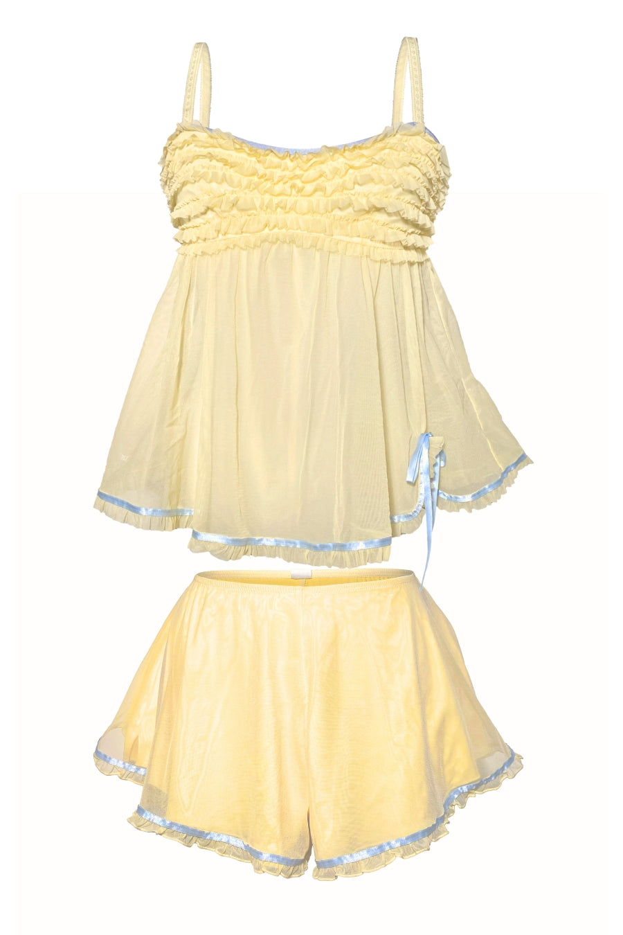 Available in Raspberry, a vibrant pink, and Buttercup, a creamy pastel yellow, Rosie features a babydoll-style cami and cheeky shorts trimmed with mesh ruffles and satin ribbons. Designed for comfortable, elegant loungewear that honours both relaxation and feminine ritual.