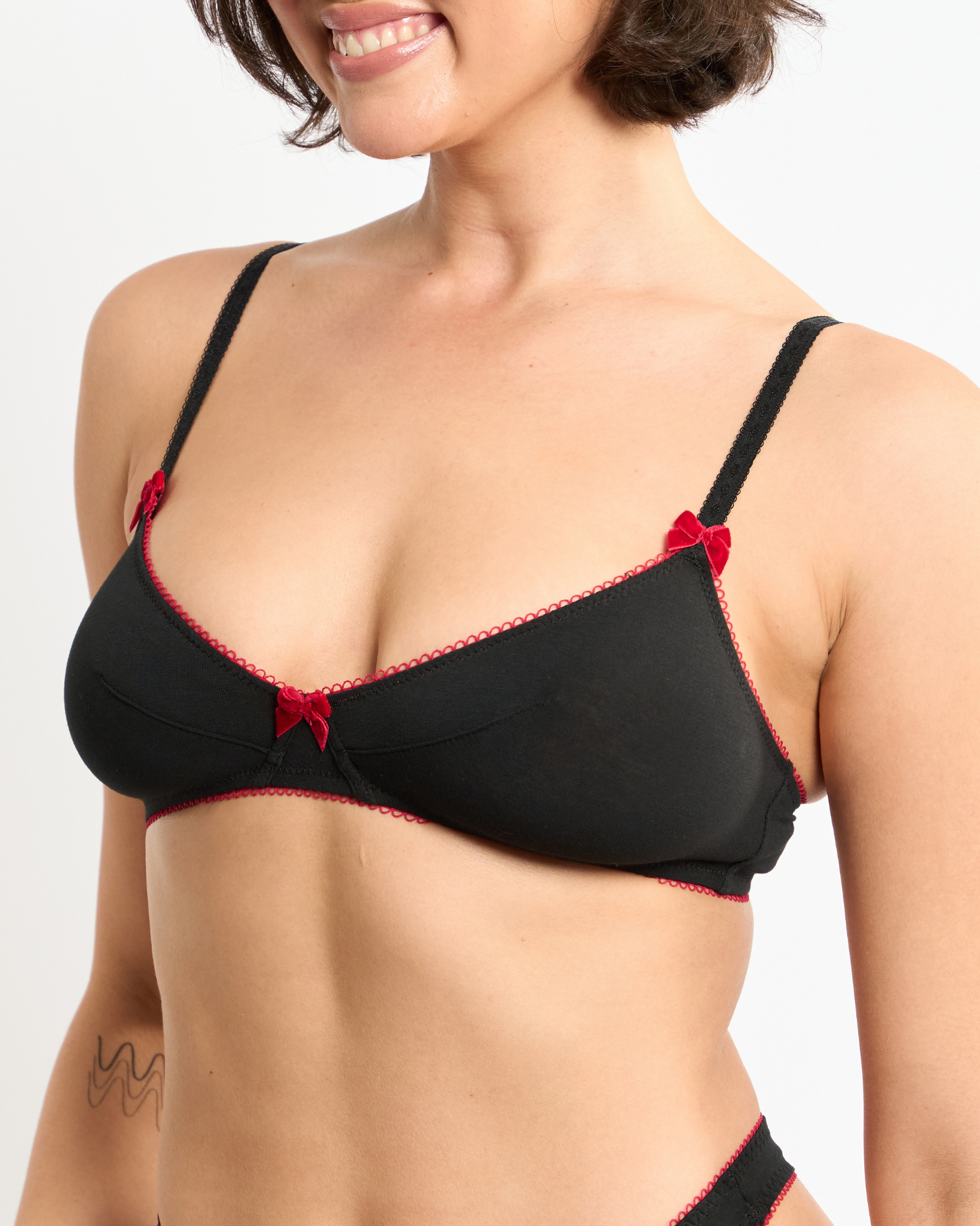Introducing the Georgia Bralette - our first organic cotton collection! Reminiscent of girlhood innocence and daydreams of cherished memories, it is crafted from black hypoallergenic fabric and finished with rich red velvet bows and delicate scalloped trim. Youthful yet provocative, Georgia is not quite as cute as she seems, delivering a far more premium and elevated feel to cotton than ever before.