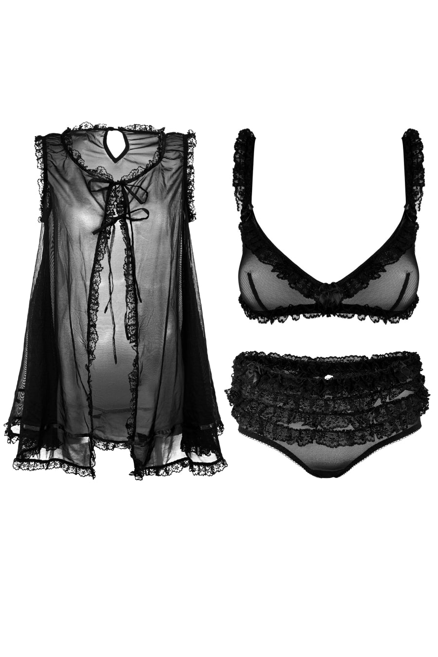 Introducing Harper: seductive black mesh and playful lace ruffles blend in a bold tribute to the sultry allure of burlesque. Inspired by the dark, mysterious cabaret scene, this piece plays with sheer textures and flirty details to evoke the thrill of late-night encounters. Harper captures the essence of secret rendezvous and irresistible intrigue, where every touch teases and every glance captivates.